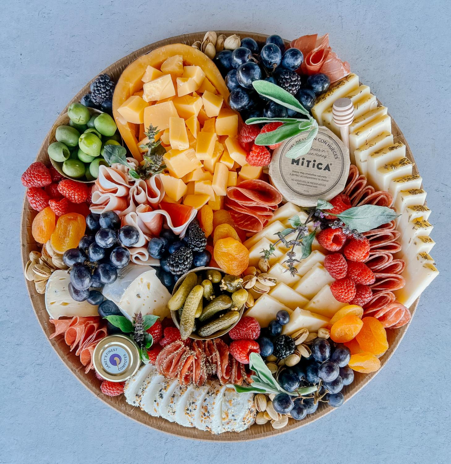 4 cheeses, 3 cured meats. Nuts, olives and pickles, fresh and dried fruit, honey, jam. Fresh herb garnish. Assorted crackers on side. Serves approximately 11-15 (appetizer portion).